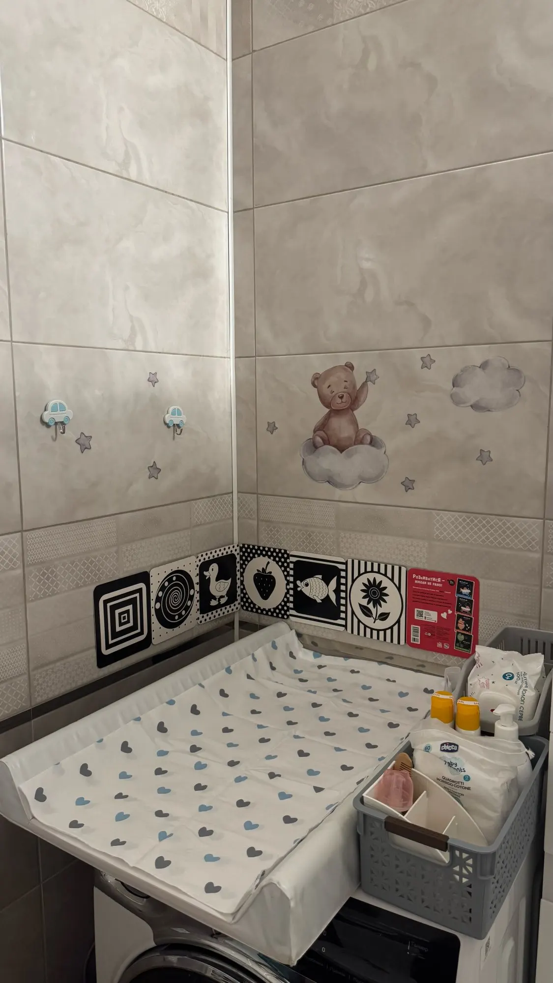 Ja det går utmärkt att fästa på släta ytor som garderober, leksaksskåp, skötbord.