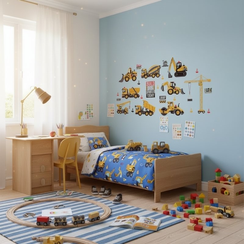 För ditt barn blir det en plats där fantasin får ta fart. Kanske är de själva byggledaren som styr kranen, kör lastbilen eller planerar nästa bygge. De pekar, skrattar och leker mitt i sin egen värld där allt är möjligt. En dekor som inte bara fyller rummet med färg, utan också med drömmar om att bygga stort.