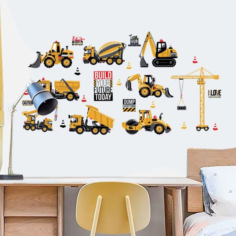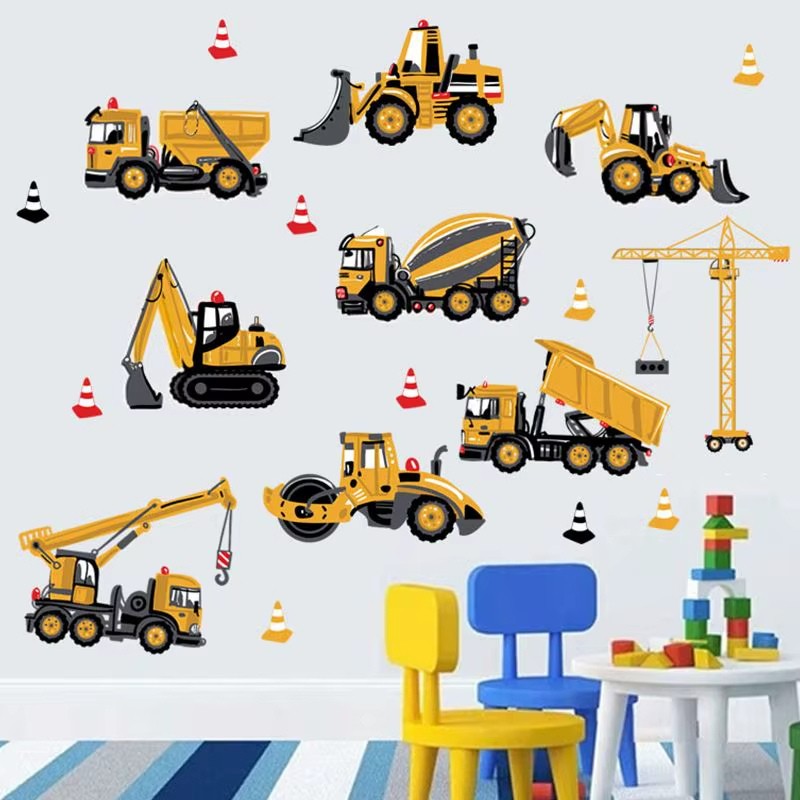 Den här väggdekoren förvandlar barnrummet till en livlig byggarbetsplats. Med grävskopor, lyftkranar, cementblandare och andra byggmaskiner skapas en energifylld och kreativ miljö som inspirerar till lek och upptäckarlust. De starka färgerna och tydliga detaljerna ger väggen ett kraftfullt uttryck.
