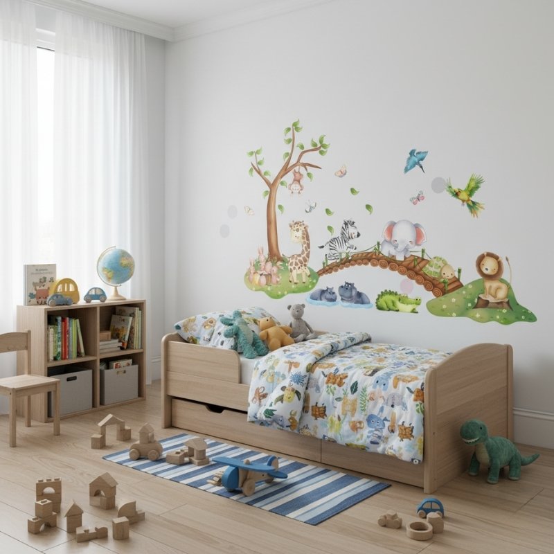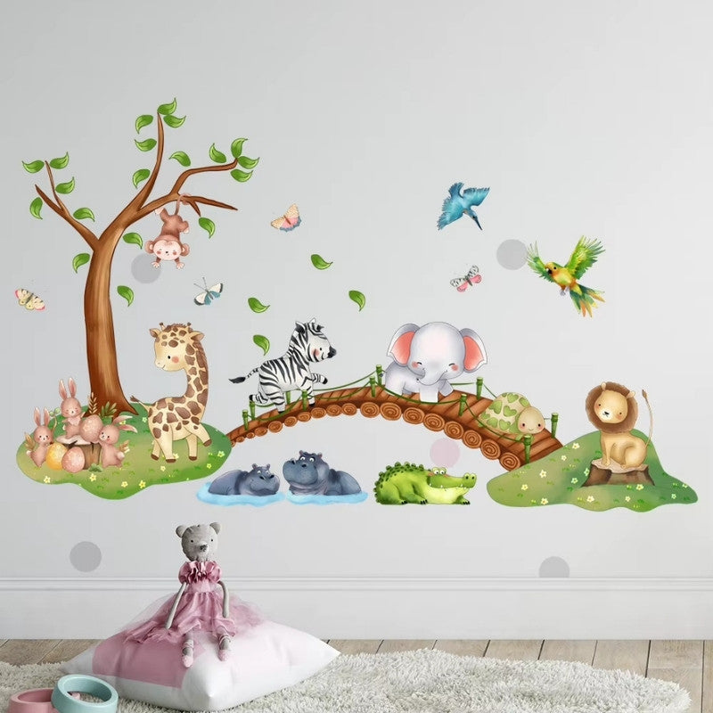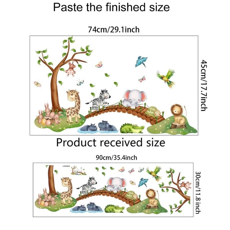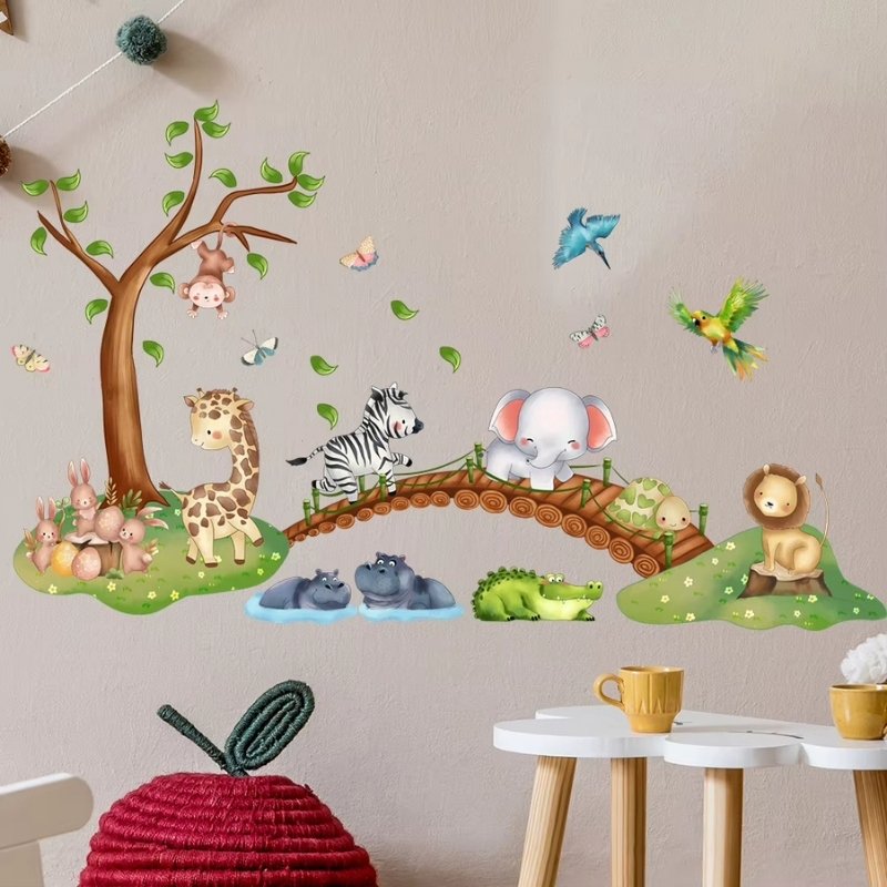 Dessa charmiga väggdekaler fyller rummet med liv, färg och djungelns vilda glädje. Elefanten vandrar över bron, zebran travar efter och uppe i träden hänger aporna glatt med fjärilar, papegojor och en vänlig giraff.