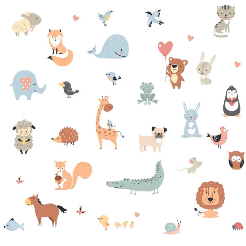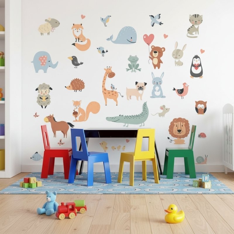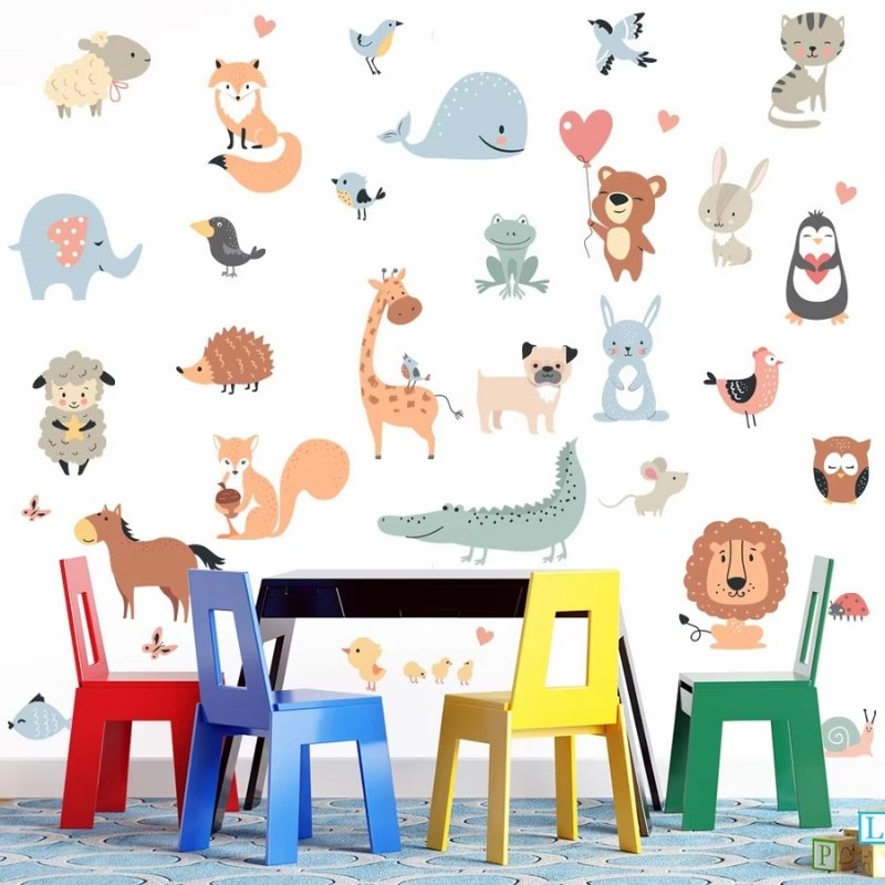 Ditt barn kanske pekar och berättar egna små historier om djuren på väggen, hittar på namn eller fantiserar om var djuren bor. En rolig och inspirerande dekoration som blir en naturlig del av vardagens lek och samtal.
