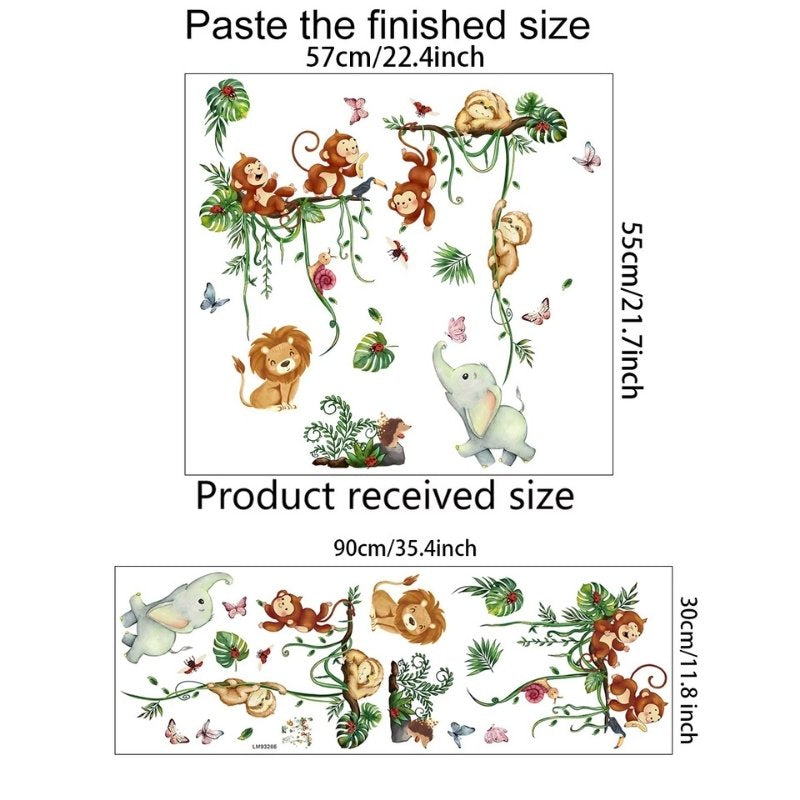 Denna charmiga väggdekor bjuder in till en fantasifull värld där apor klättrar, elefanten blåser fjärilar och lejonet vakar snällt från marken. De glada figurerna och de mjuka färgerna skapar en trygg och lekfull atmosfär som passar perfekt vid sängen, lekhörnan eller skötbordet.