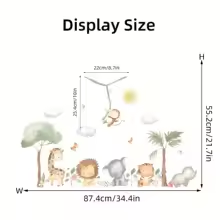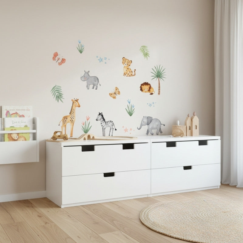 Denna väggdekor förvandlar barnrummet till ett sagolikt djungeläventyr där giraffen kikar fram bland träden, lejonet ler nyfiket och apan svingar sig i lianerna. De milda pastellfärgerna och de lekfulla djuren skapar en varm och harmonisk atmosfär – perfekt för att ge rummet liv utan att störa den lugna känslan som behövs vid vila och nattning.