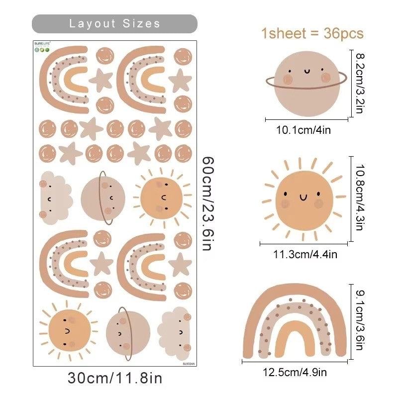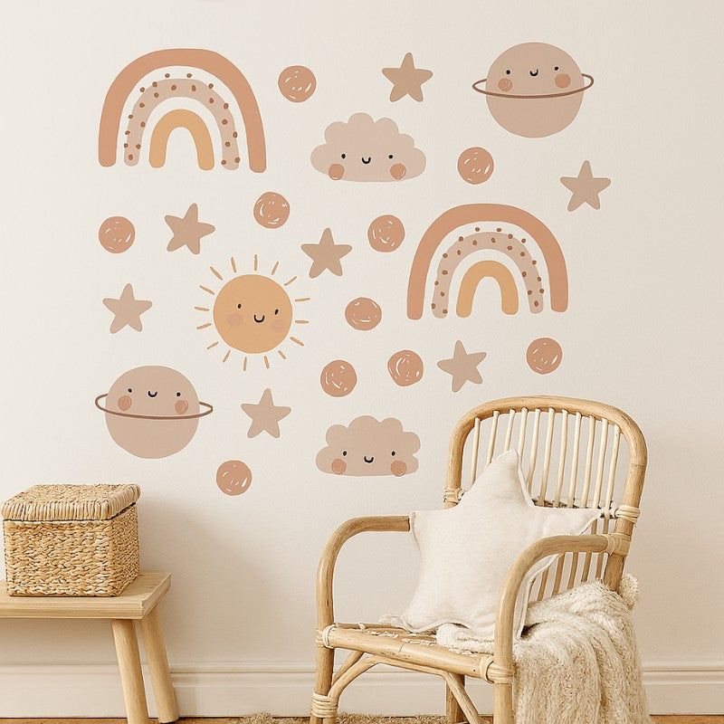 Väggdekoren fylls av glada solar, regnbågar, moln, stjärnor och små planeter – alla med vänliga ansikten som skapar en varm och lekfull atmosfär i barnrummet. De mjuka formerna och uttrycken ger rummet en lugn och trygg känsla, samtidigt som dekoren väcker barnets fantasi.