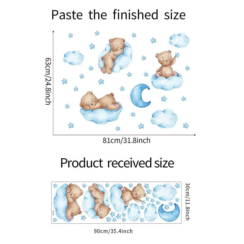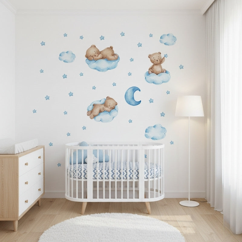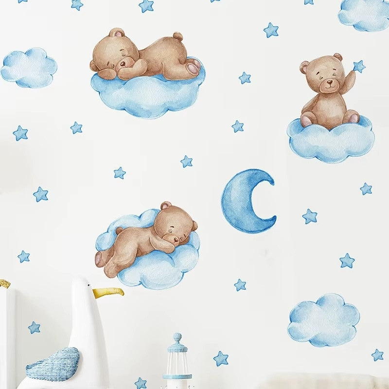 Väggdekoren fylls av söta björnar som vilar på mjuka blå moln, omgivna av stjärnor och en vänlig måne. Den mjuka stilen och de harmoniska figurerna skapar en trygg och rogivande stämning i barnrummet perfekt för vila, sagoläsning eller mysiga kvällsstunder.