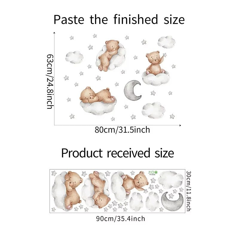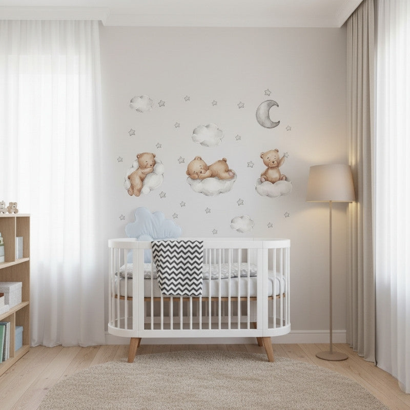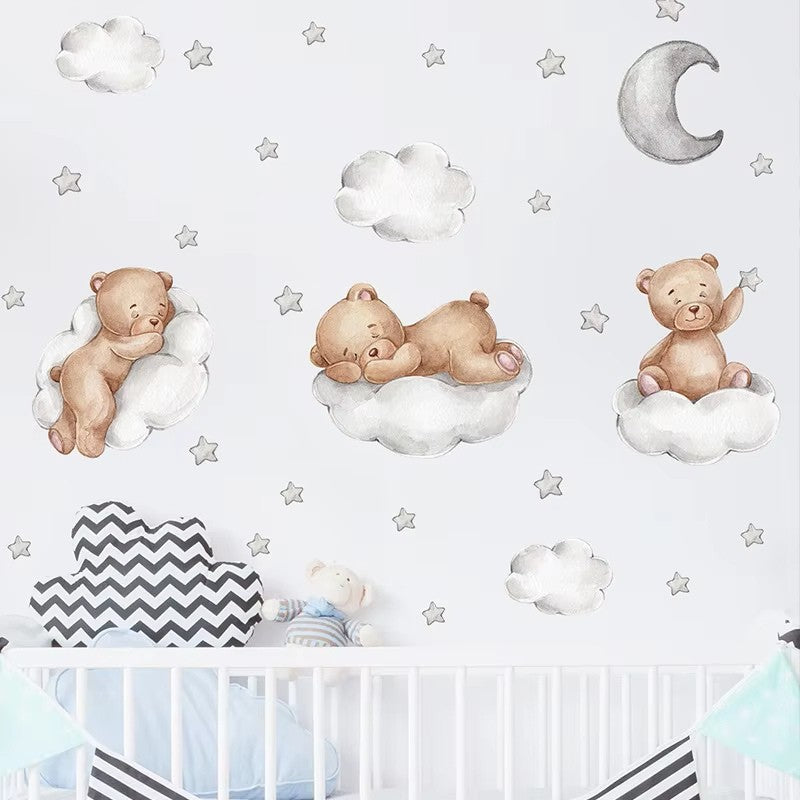 Väggdekoren fylls av sovande björnar, mjuka moln, stjärnor och en måne som tillsammans skapar en trygg och rogivande känsla i barnrummet. De stillsamma figurerna ger rummet ett mjukt uttryck som passar perfekt vid spjälsängen eller i vilohörnan.