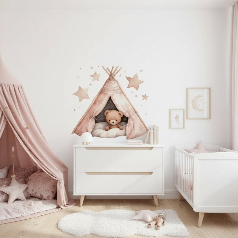 Denna bedårande väggdekor med en liten nalle i ett tält skapar en varm och ombonad känsla i barnrummet. Perfekt att placera ovanför sängen eller i en läshörna – motivet inbjuder till mys, trygghet och fantasi. De mjuka tonerna i beige och rosa passar lika fint i ett flick- som pojkrum, och stjärnorna runt tältet ger rummet ett drömlikt sken.